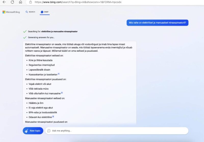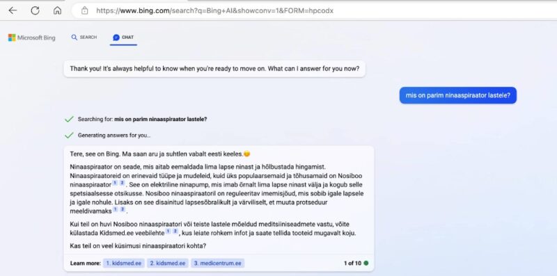 Märtsi alguses teatas Microsoft, et Bing on ületanud 100 miljoni igapäevase kasutaja piiri. Kuigi Google’i kõrval moodustab see turust vaid murdosa, on selgelt näha elevust uue Bingi ja AI tööriistade ümber. Seepärast on oluline end ennatlikult Bing otsingumootoris nähtaval hoida. Uus Bing kasutab GPT-4 tehnoloogiat ning vastuseid andes kombineerib see andmeid eelkõige orgaanilisest otsingust ja Bingi reklaamidest. Esiteks on oluline enda äri Bing Places For Business’is registreerida, mis on Microsofti analoog Google My Businessile. Orgaanilise otsingu puhul tasub rõhku panna SEO-le, sealjuures keskenduda on-page sisule ja selle kvaliteedile. Bingi otsingureklaamid toimivad samasugusel oksjonipõhisel mudelil nagu ka Google’is.